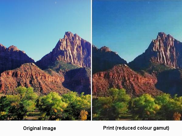 Because a printer has a limited range of colours (technically the ‘colour gamut’), it can’t produce every shade that’s called for; it has to use the closest one it can produce. With a smaller colour range to choose from, the shade chosen will be further away from the true one. The result is a gaudy image, sometimes described as ‘picture postcard’, after cheaply printed seaside postcards, which also have limited colour gamuts.