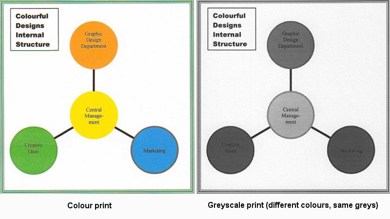 This problem is related to the colour gamut restriction, but for mono laser printers. If a printer can only produce a limited number of shades of grey (greyscales), different greys in an original may appear as the same colour in a printout. Most mono lasers claim to be able to reproduce 256 grey levels. Not all can, but an added difficulty crops up when trying to print a graph or chart when the original is in colour.
